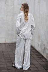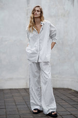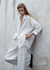 Collection 02 continues with clean, polished wardrobe essentials. These pants are tailored from soft pinstriped cotton that's softly pleated from the high-rise waistband. Designed for an oversized finish, they drape so effortlessly through the wide legs, and pockets keep the fit functional. Designed to wear with the matching Oversized Shirt, they mix and match just as well.