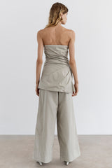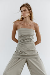 This piece can be worn during business hours or at your next event. It features a straight, strapless neckline and dramatic ruching that gathers at the right waist for added definition. Wear yours with the matching Wide Leg Pant, or with denim at your next long lunch.